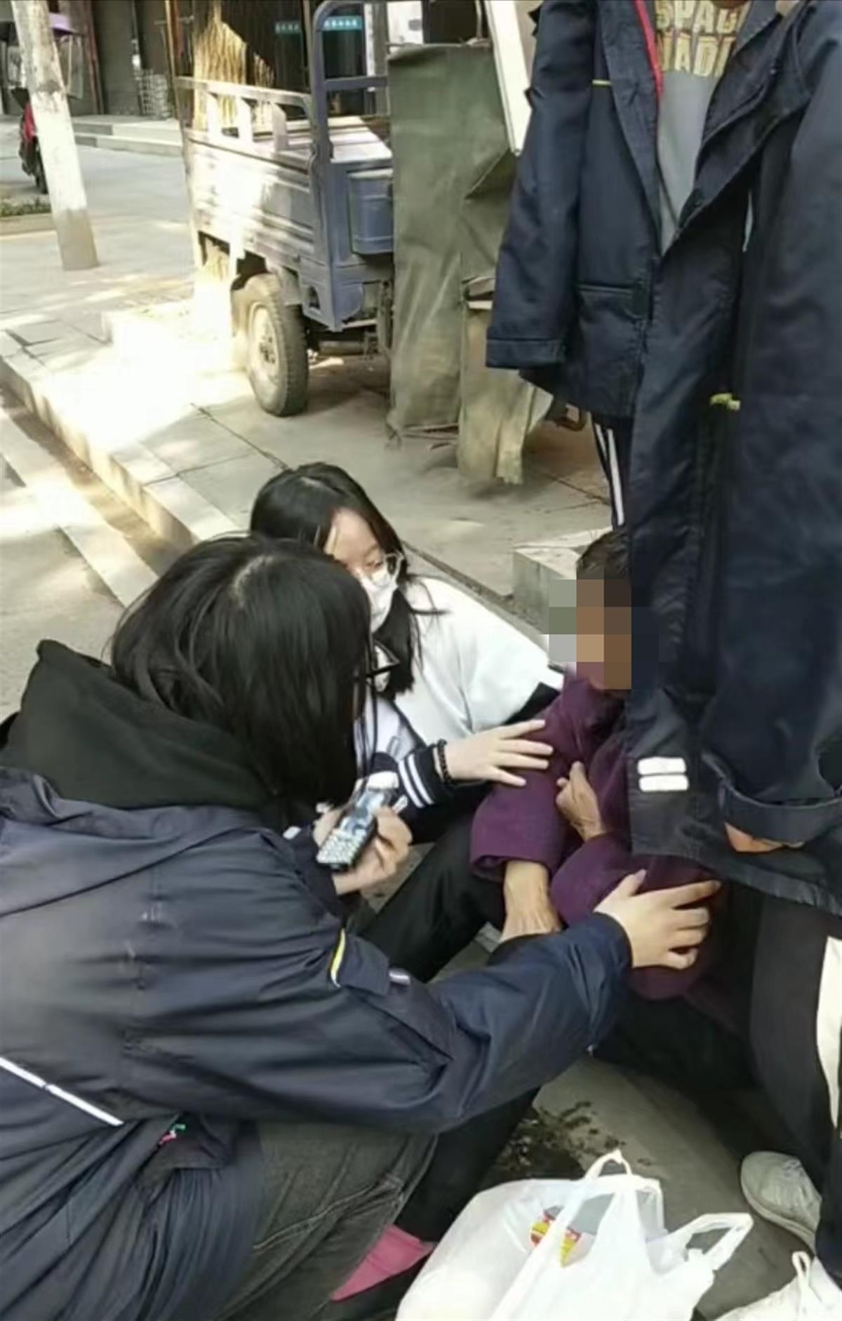 老人受伤倒地,现场令人揪心。幸而有她们,五个挺身而出的高中女孩,给了老人危难中最珍贵的陪伴,也让善良正气之风随着寻人启事满城流传。