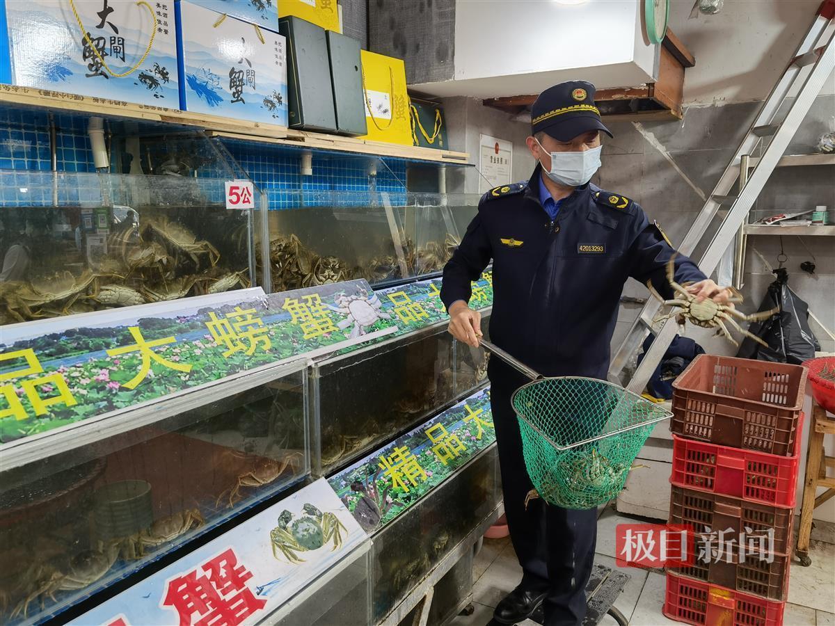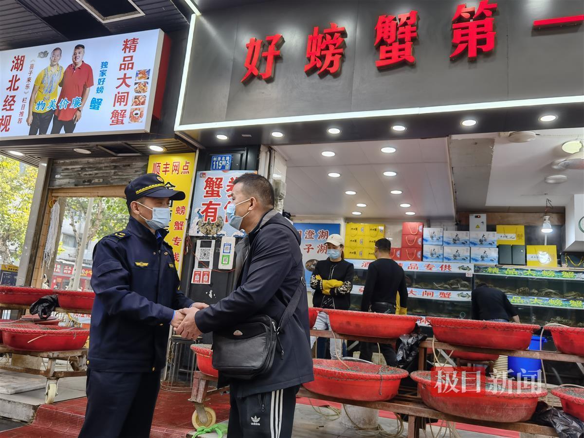 “算起来不贵,一只螃蟹10元钱。”张世君与城管队员通知购买人来店里取货,在店外维持秩序,防止人员聚集。