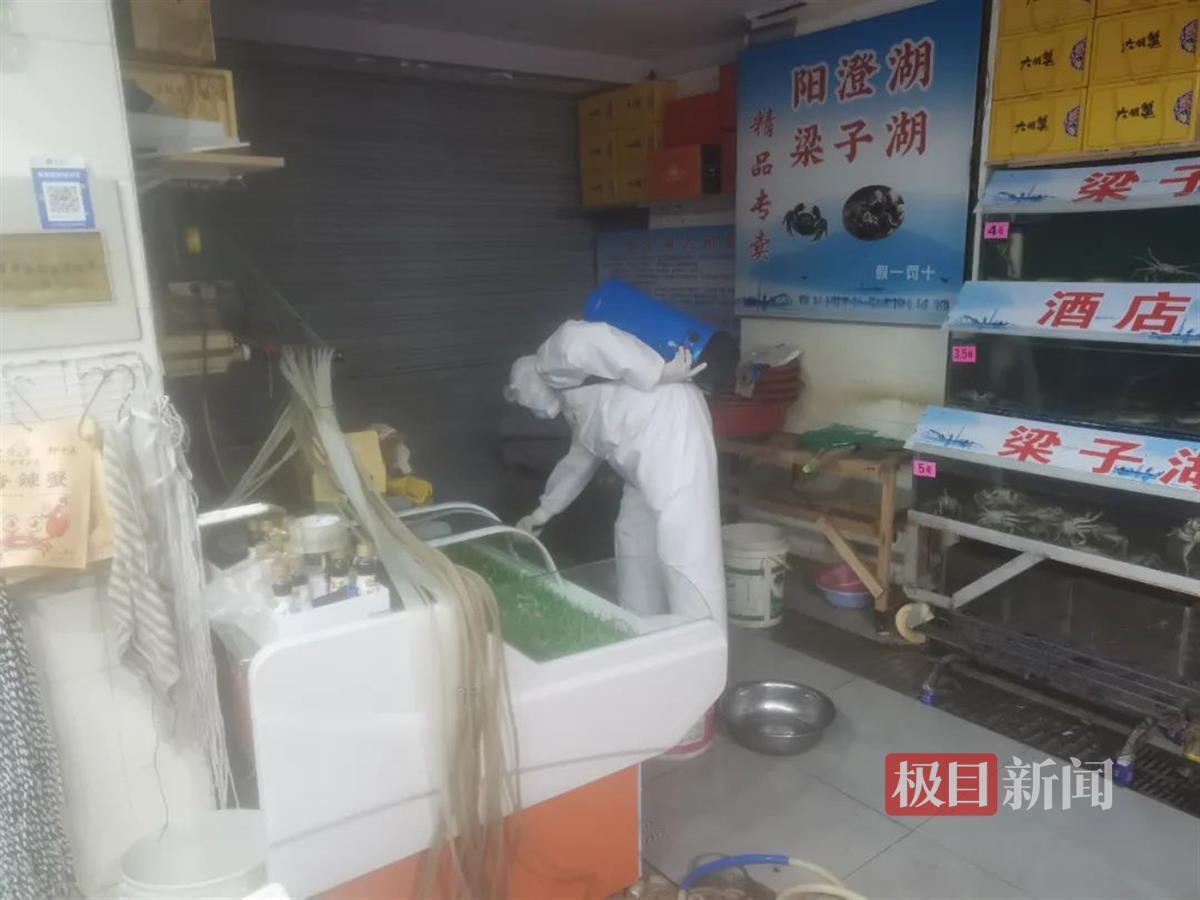 10月21日晚上8时许,螃蟹店的环境取样、消毒消杀,有条不紊地进行。