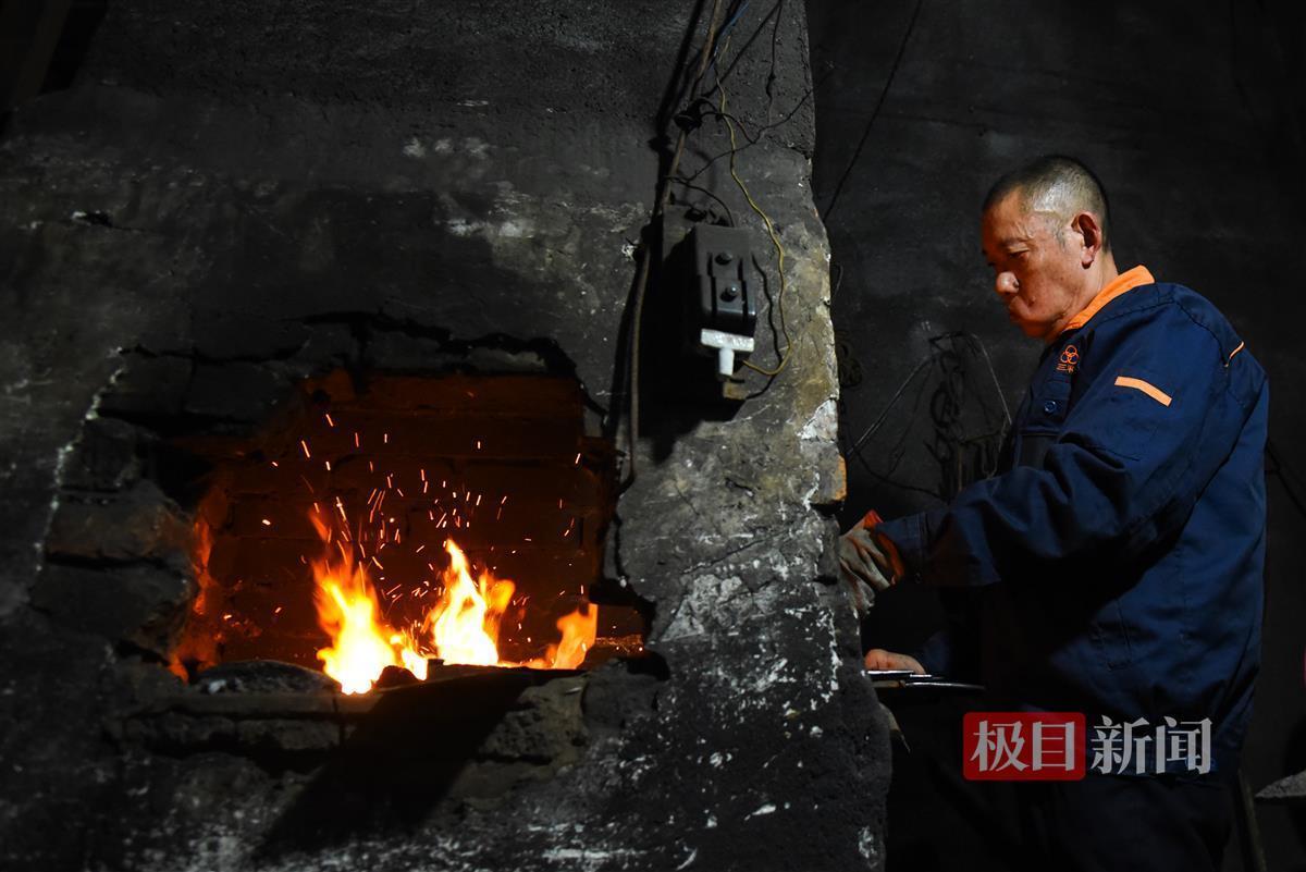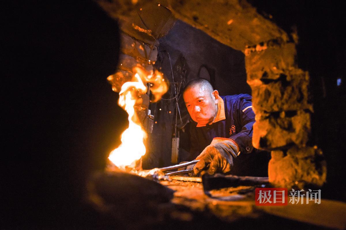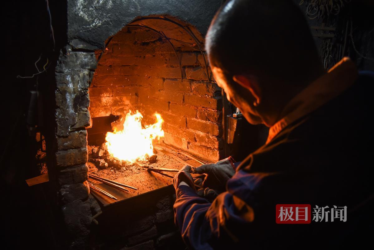老铁匠龚爱清在火炉旁煅烧熟铁,高温将脸上烤得通红