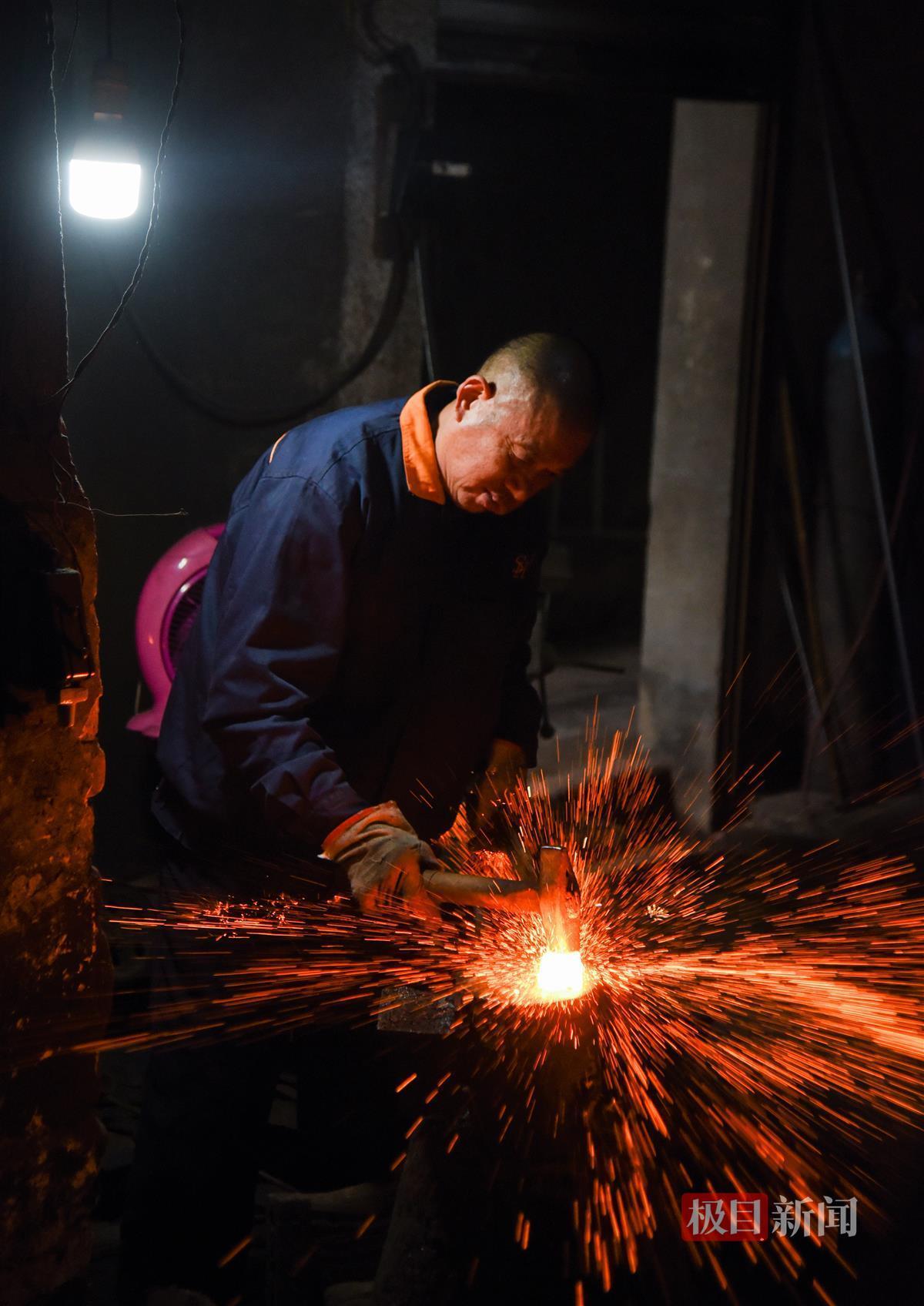 71岁的龚爱清正佝偻着身姿,有节奏地敲打着铁块。铁锤举过头顶,然后高高落下,一次次的剧烈重击下,炽热的熟铁逐渐变形,并散射出耀眼的钢花。