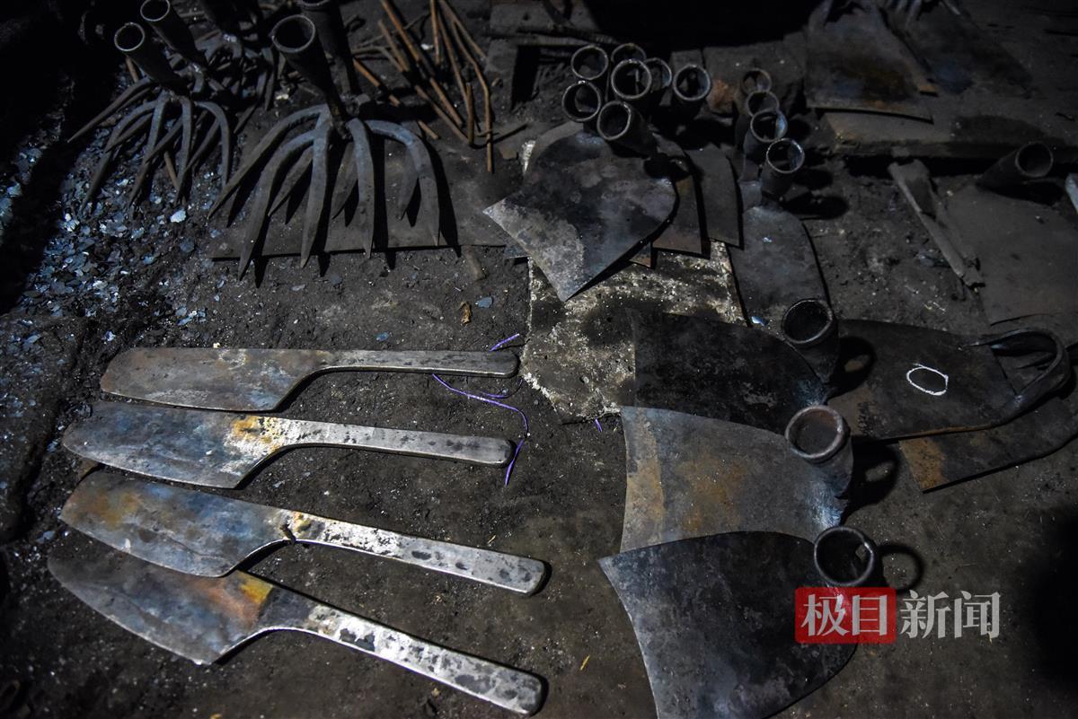 极目新闻记者沿着巷口拐几道弯,寻着铛铛声走去,铁锤敲打的声响越来越清脆。一处二层楼的偏房内,烧得通红的熟铁将昏暗的屋子照亮。屋子不大,除了一些打铁工具和半成品,最显眼的就是那个火势烧得旺盛的打铁炉。