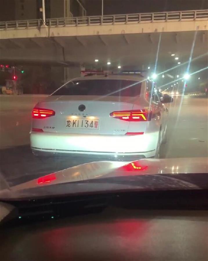 网传视频显示,在一处公路上,一辆车牌为“龙K1134警”牌照的警车停在原地,开着警灯,挡住了后车前进的道路。视频发布者表示:“被‘龙K’警车堵了。”