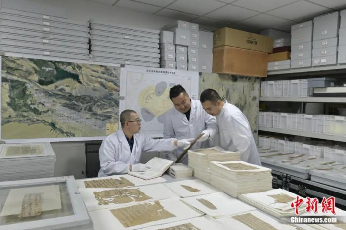胡兴军(左一)与同事在室内整理出土文书。受访者供图