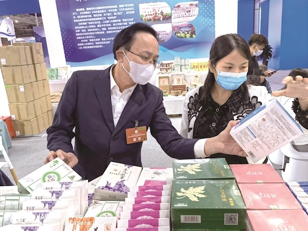 全国劳务品牌大会上,蕲春县县长陈丹(右一),县人社局局长江云生(左一)现场推介。