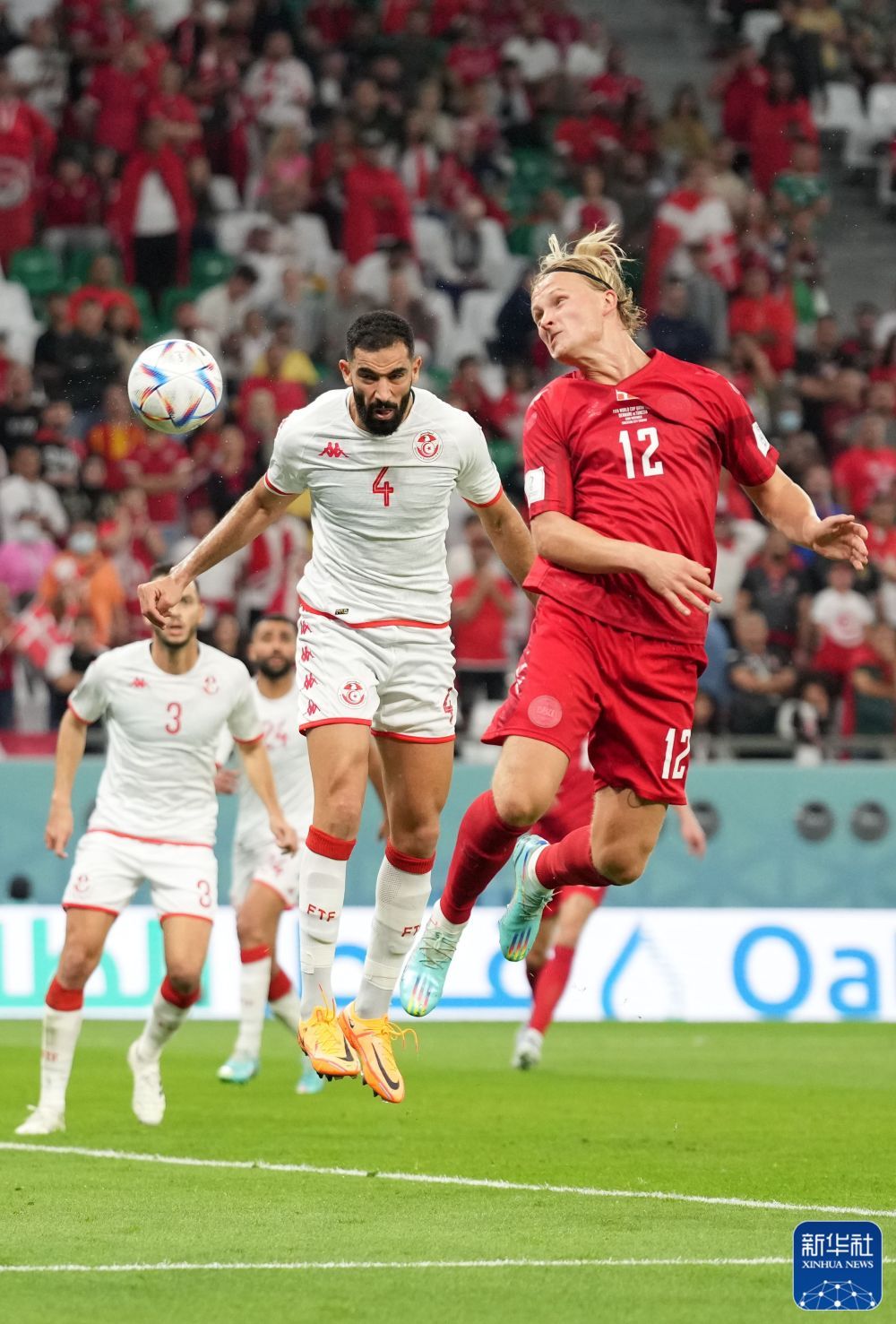 丹麦队球员多尔贝格(右)与突尼斯队球员亚辛·梅里亚争顶。新华社记者 郑焕松 摄