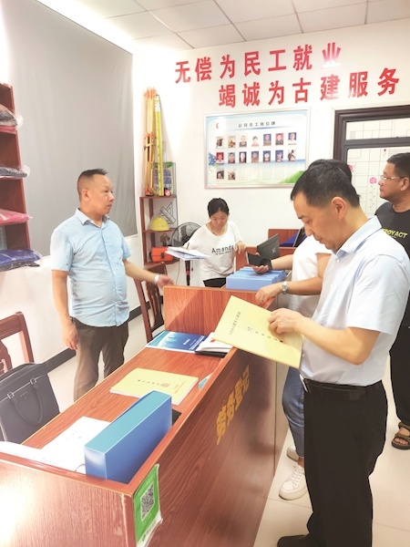 大冶市人社局局长黄朝海(右一)在古建零工驿站调研,该驿站年开展古建行业人力资源服务1.7万余人次。