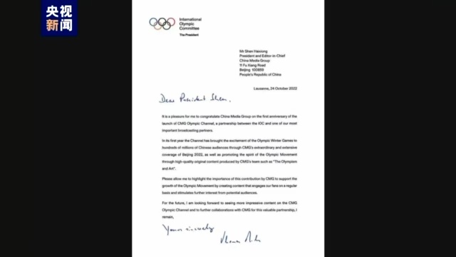 今年十月,国际奥委会发布了一份由其委托进行的研究报告,称北京2022年冬奥会的全球转播观众人数超过20亿,世界各地的观众在由奥委会授权的频道上观看了总计7130亿分钟的奥运会报道,与2018年平昌冬奥会相比增加了18%,达到了史无前例的规模和成功。在奥林匹克频道开播一周年之际,国际奥委会主席巴赫先生向总台发来贺信,盛赞总台为推动奥林匹克精神做出的贡献。巴赫在贺信中表示,总台是国际奥委会在全球最重要的媒体伙伴之一,双方友好的合作关系至关重要。巴赫强调,总台对于奥林匹克运动发展的支持意义重大,总台创意十足的节目和持续的传播,将会吸引更多观众爱上奥林匹克运动。