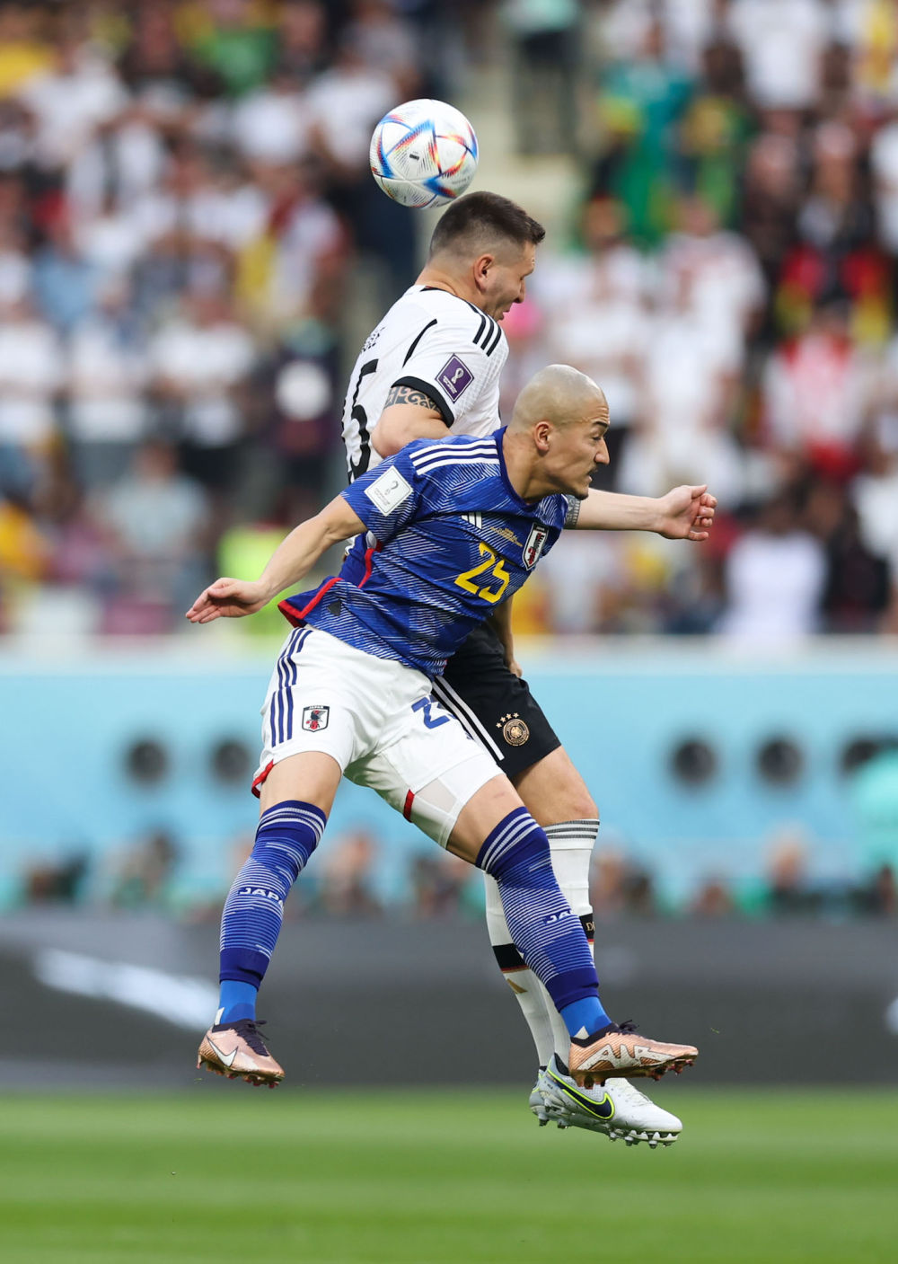 德国队球员尼克拉斯·聚勒(上)与日本队球员前田大然拼抢。新华社记者 潘昱龙 摄