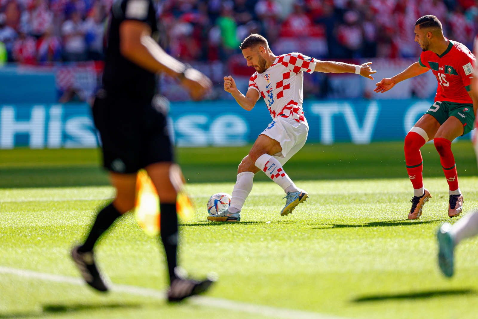 摩洛哥队这边充分利用球星作用,身居右路的阿什拉夫和齐耶赫多次连线,向克罗地亚队腹地发起冲击。克罗地亚队则在莫德里奇的调度下,利用技术优势不断向对手禁区渗透。第46分钟,克罗地亚抓住对方的疏忽在摩洛哥门前觅得良机,弗拉希奇的射门被摩洛哥门将布努扑出。上半场战罢,双方均未能改写比分。