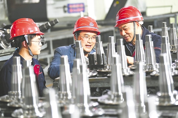 11月9日,吴华伟教授(中)在湖北三环锻造有限公司指导生产。他率领的新能源汽车团队多项技术在企业得到应用,其“智能车辆通用底盘优化设计及跨域安全控制技术研究及应用”获全国发明创新奖一等奖。