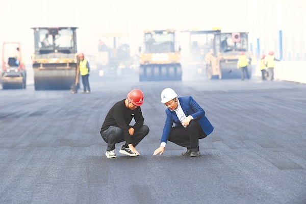 1月9日,王元元博士(右)在襄阳河谷大桥建设现场工作。他研发的低成本视觉感知路面服役状态数字化测量技术,已立项国家自然科学基金项目。