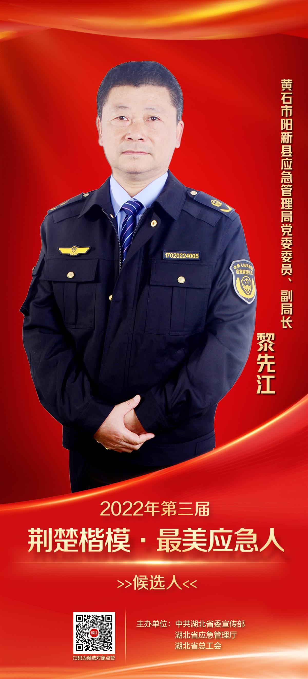 黎先江,男,53岁,现任黄石市阳新县应急管理局党委委员、副局长,曾获湖北省“五一”劳动奖章、黄石市“五一”劳动奖章、阳新县“优秀共产党员”“阳新楷模”等多项荣誉。