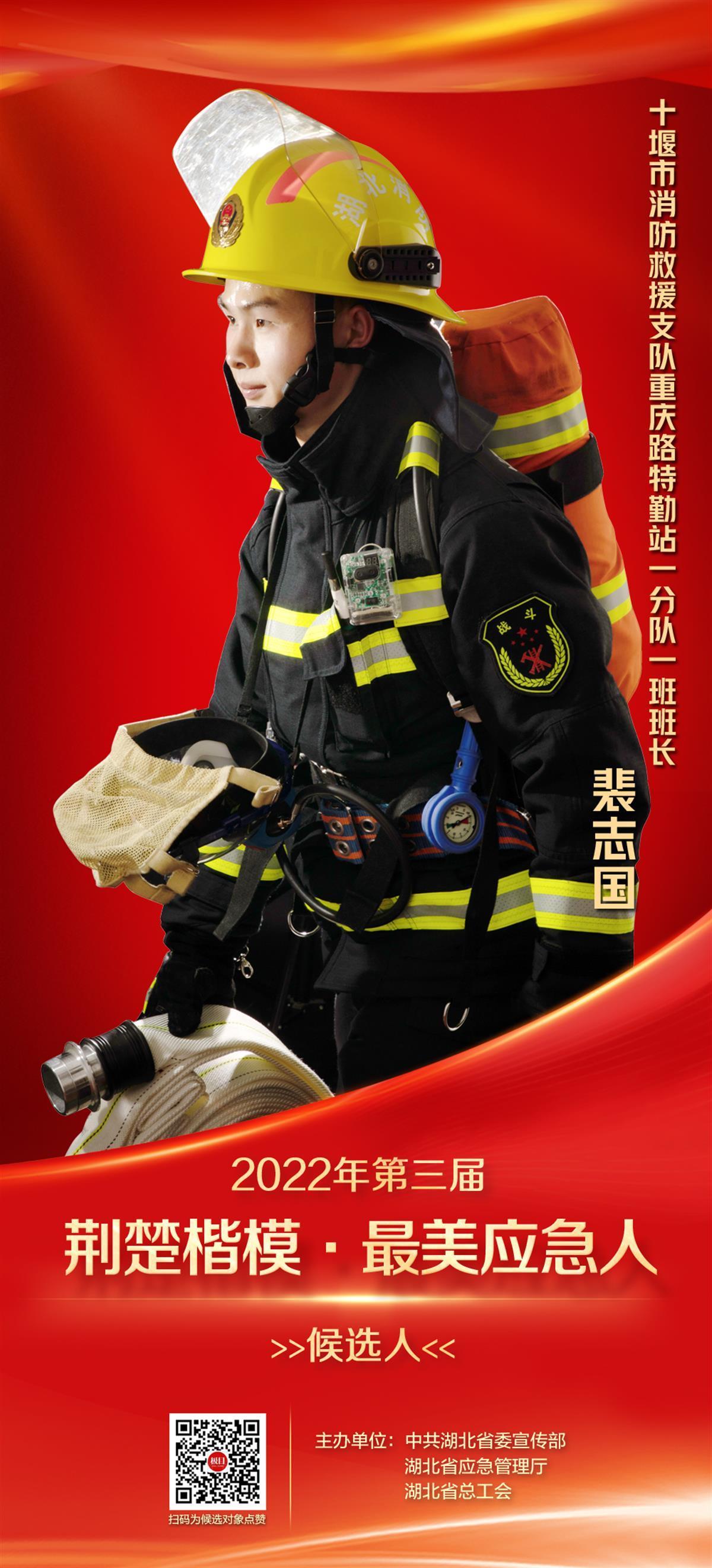 裴志国,男,30岁,2015年加入消防救援队伍,现任十堰市消防救援支队重庆路特勤站班长,曾荣立二等功2次、三等功1次,获“全国119消防先进个人”“全国青年岗位能手”“湖北五一劳动奖章”“湖北青年五四奖章”“荆楚楷模·最美消防卫士”等荣誉。