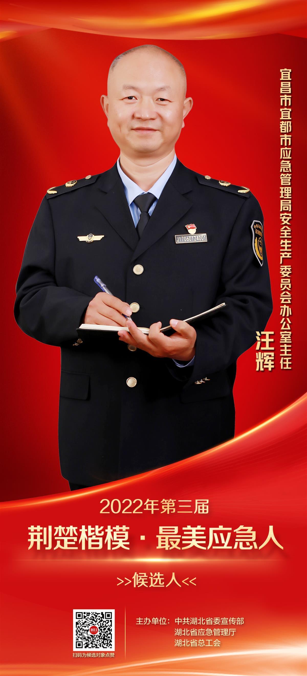 汪辉,47岁,现任宜昌市宜都市应急管理局安全生产委员会办公室主任,曾被中共湖北省委、省人民政府、省军区授予“2020年度湖北省防汛救灾先进个人”称号。