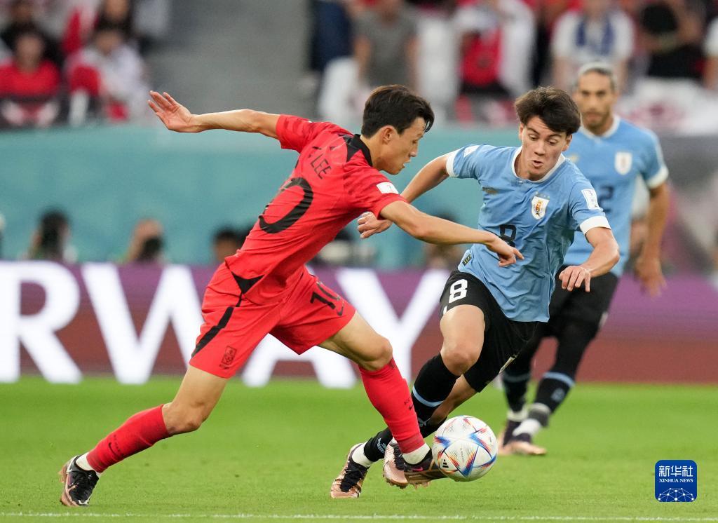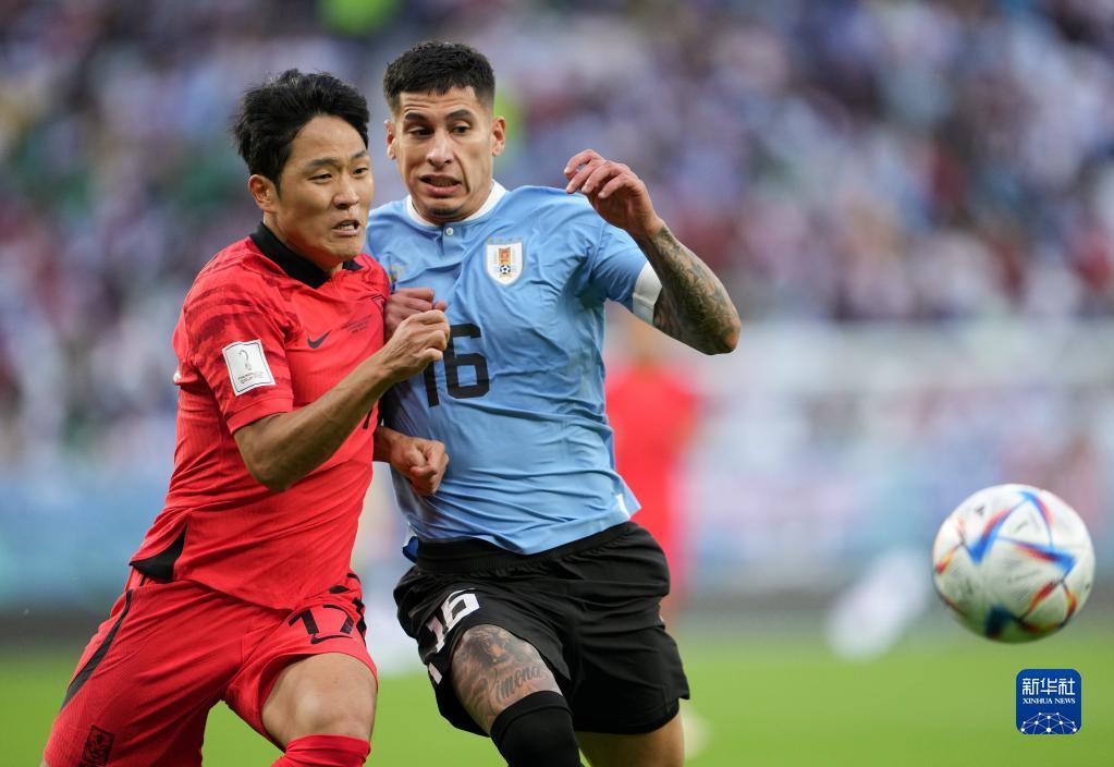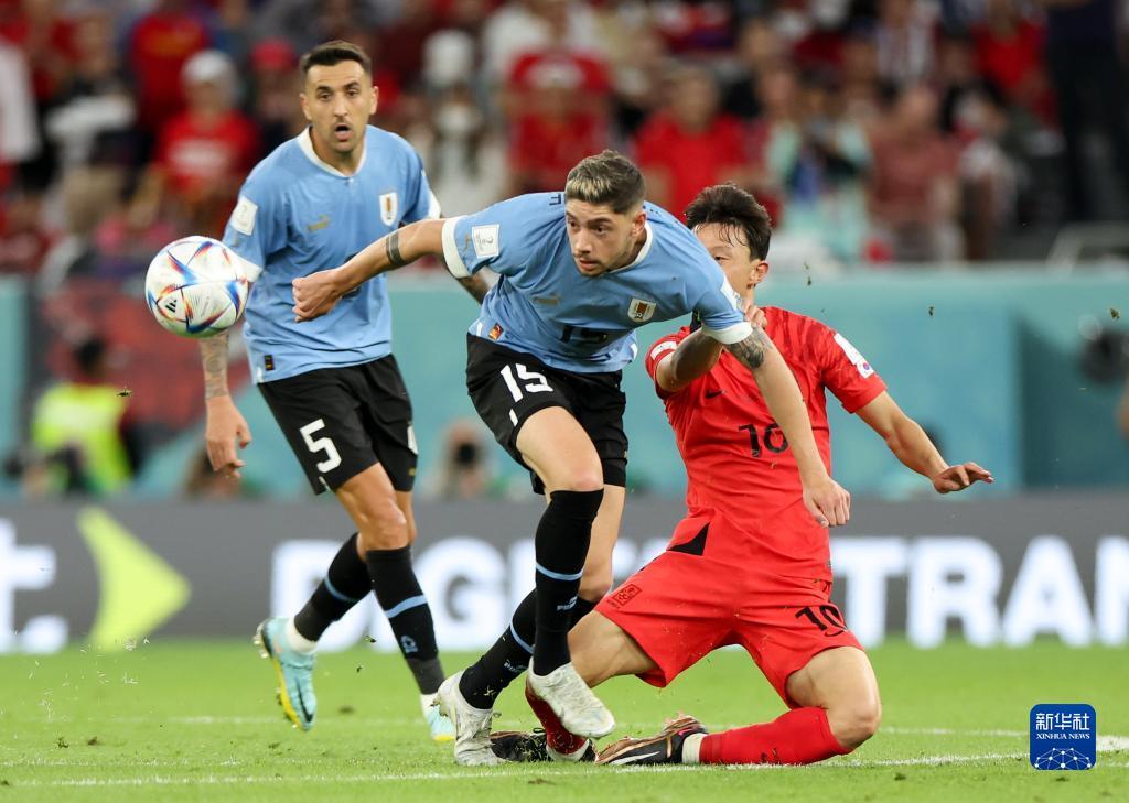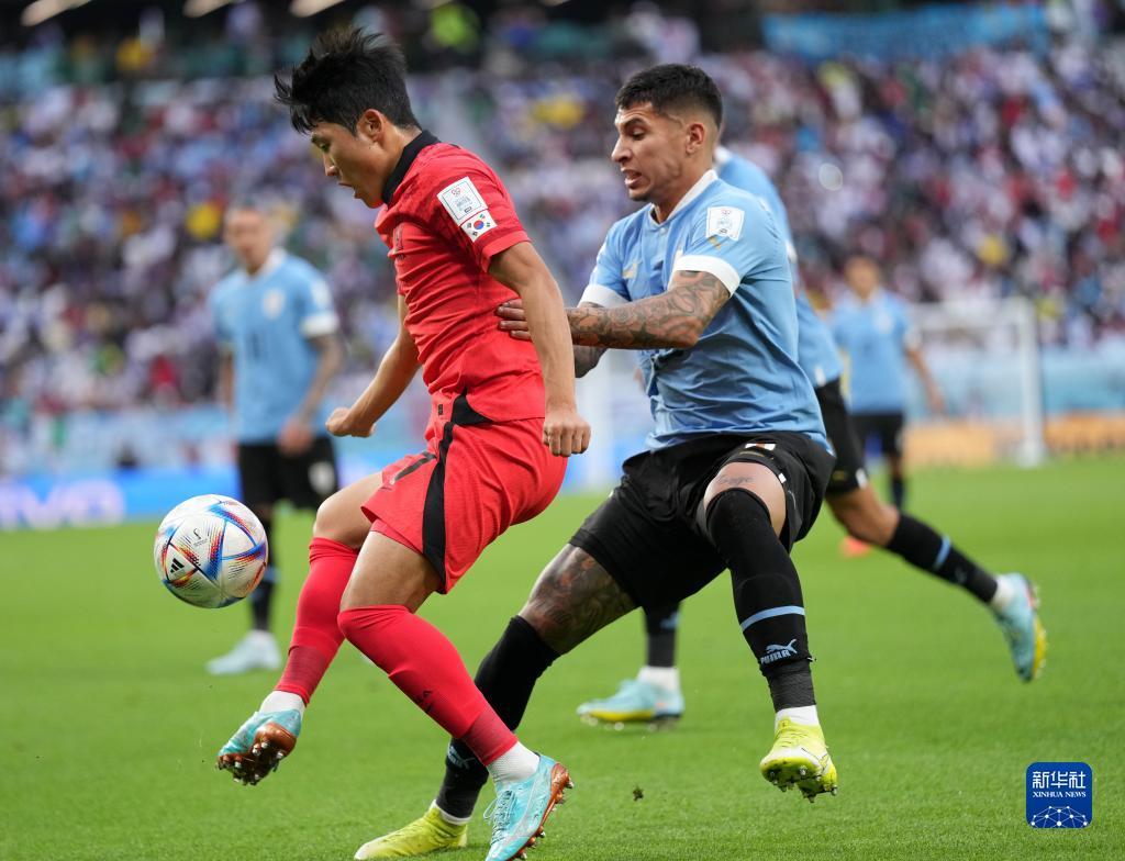 11月24日,韩国队球员黄义助(右)与乌拉圭队球员费德里科·巴尔韦德(中)在比赛中。新华社记者 韩岩 摄