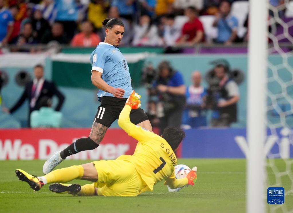 11月24日,韩国队守门员金承奎(右)扑救乌拉圭队球员达尔温·努涅斯的射门。新华社记者 孟永民 摄