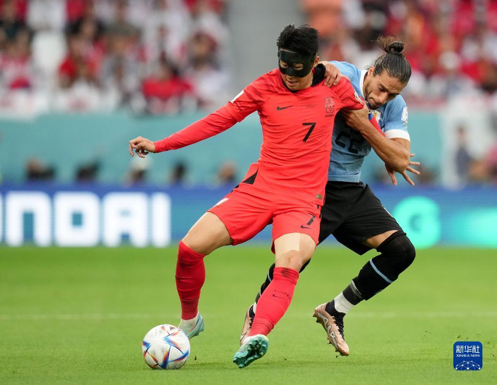 11月24日,韩国队球员孙兴民(左)与乌拉圭队球员马丁·卡塞雷斯拼抢。新华社记者 孟永民 摄