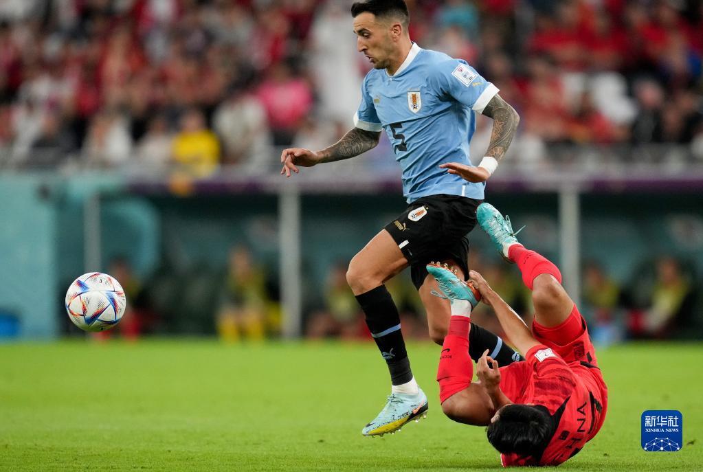 11月24日,乌拉圭队球员马蒂亚斯·贝西诺(左)与韩国队球员罗相镐在比赛中。新华社记者 孟永民 摄