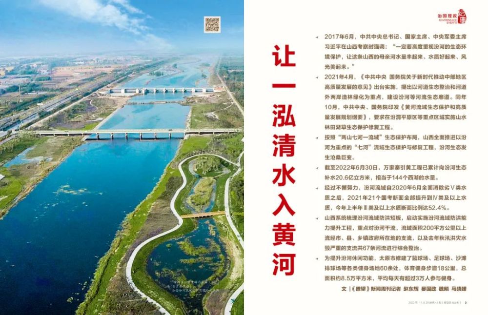 ◆ 经过不懈努力,汾河流域自2020年6月全面消除劣Ⅴ类水质之后,2021年21个国考断面全部提升到Ⅳ类及以上水质,今年上半年Ⅲ类及以上水质断面比例达52.4%。