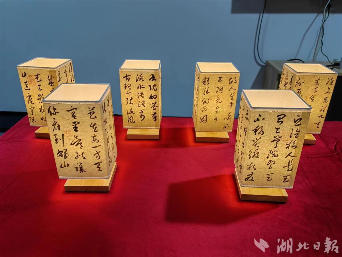 展会上,校园标志性建筑和风景被绘制后制成书签、台历、钥匙扣,明信片、台灯、抱枕、印章等作品,融入校园文化,极具特色。“借着做产品设计的机会,我再次参观了校史馆,对学校的发展历史有了更深刻的认识。”书法2103班学生罗盈盈此次参展的产品为一组台灯,名为《书法手作台灯——星幕》。据其介绍,从创意构思到成品出炉共历时一周时间。过程中,她多数次调整字体结构和灯光亮度,力求展现出传统文化之美和校园文化的精髓,最终以书法结合校史校训来呈现的作品获得了不少师生的点赞。“星光不问赶路人,看到灯壁上的校训会联想到学校对我们的期许,期望这件作品能用灯光点亮更多人的梦想。”罗盈盈说。