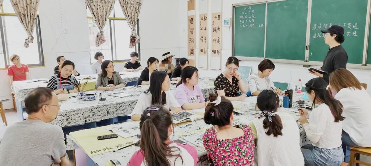 图:市书法协会会长孙延辉同志,为公园路小学教师进行书法培训。教师基本功训练成为日常。