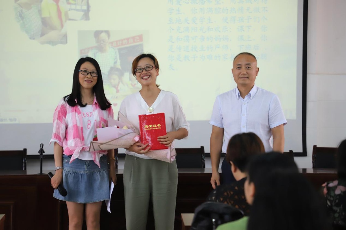 图:学校领导班子为公园路小学“最美班主任”艾小红老师颁奖。学校评选了“最美班主任”“最美教学能手”“最美夕阳红”。