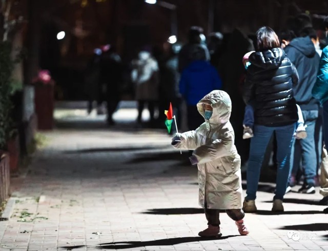随着采样的进行,天已经全黑,居民们排着队伍,按照顺序进行采样。“大家排好队,保持距离”,喇叭不时地提醒着居民。排队的人群里不少人都已经穿上了羽绒服、戴着帽子抵御寒冷。最开始排队的以居家的老人、小孩为主,随着采样的进行,上班族也逐渐赶了回来参加采样。