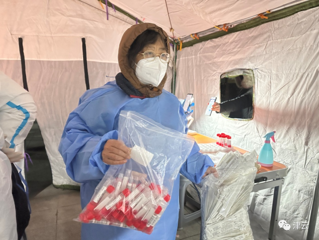 在滨海新区塘沽街道祥和家园社区,下午筛查工作正式开始,现场8名工作人员负责祥和新园和春风里小区总计1600多人的核酸筛查采样工作。作为点位负责人,社区副书记刘君“身兼数职”,所有工作都得干,前期准备、维持秩序、扫描二维码、协助医护人员、清点物品……“今天降温,我们早早在群里提示居民下楼多穿衣服,尤其是老人小孩,一定要做好保暖工作。现场我们也准备了热水、热宝,好在工作人员都是经验丰富的‘老兵’了。”刘君说。