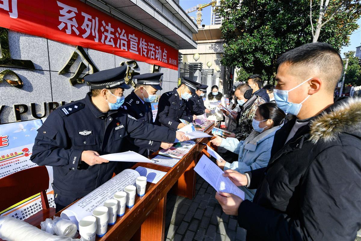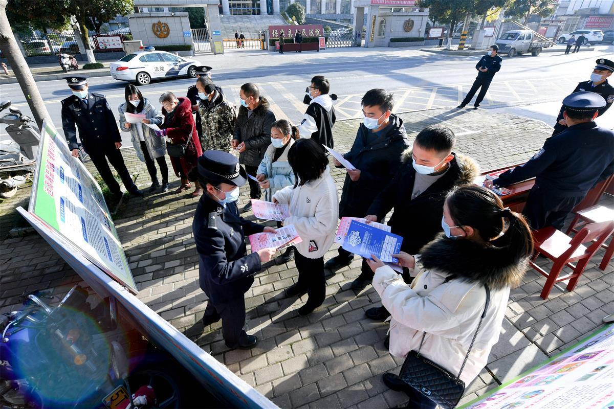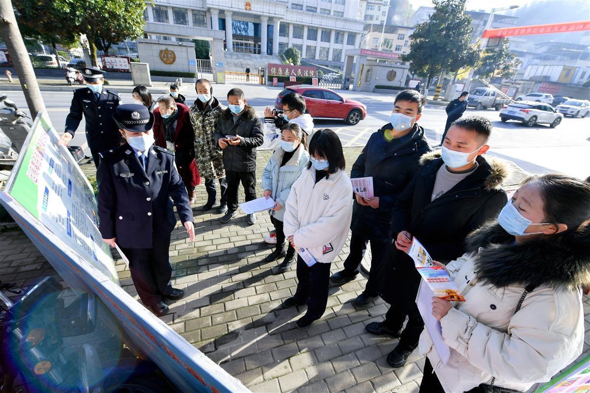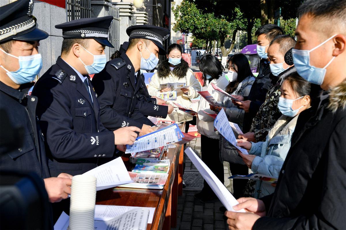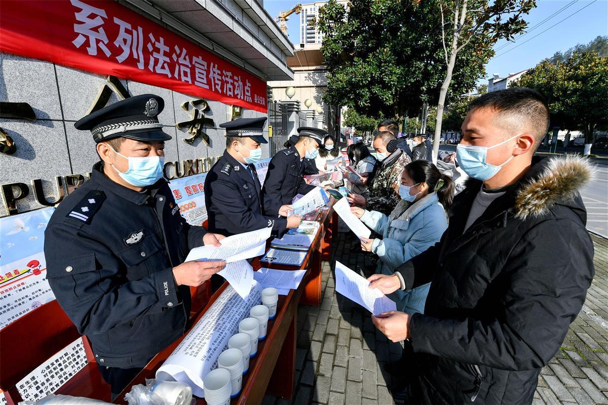 2022年12月2日,在湖北省保康县公安局法治宣传活动点,民警正在向市民进行普法宣传。