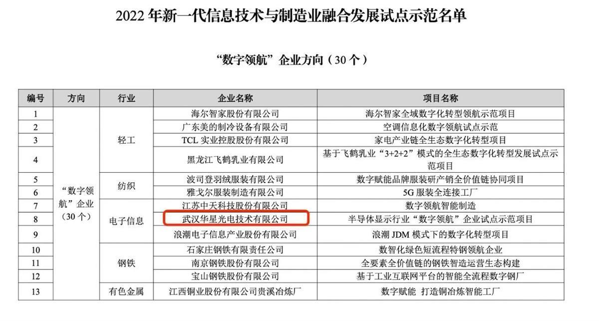 湖北日报讯(记者张真真)近日,国家工信部公示了2022年新一代信息技术与制造业融合发展试点示范名单。武汉华星入选国家首批“数字领航”企业,全国仅30家企业获此称号。