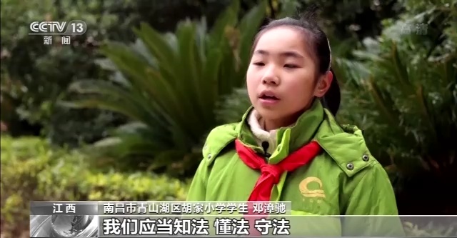 南昌市青山湖区胡家小学学生 邓漳驰:作为一名少先队员,我们应当知法、懂法、守法,遵纪守法应该从小做起,从小事做起。我也会把我今天学习到的法律知识告诉给更多的人,让大家一起知法、懂法、守法。