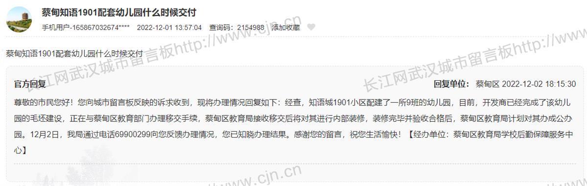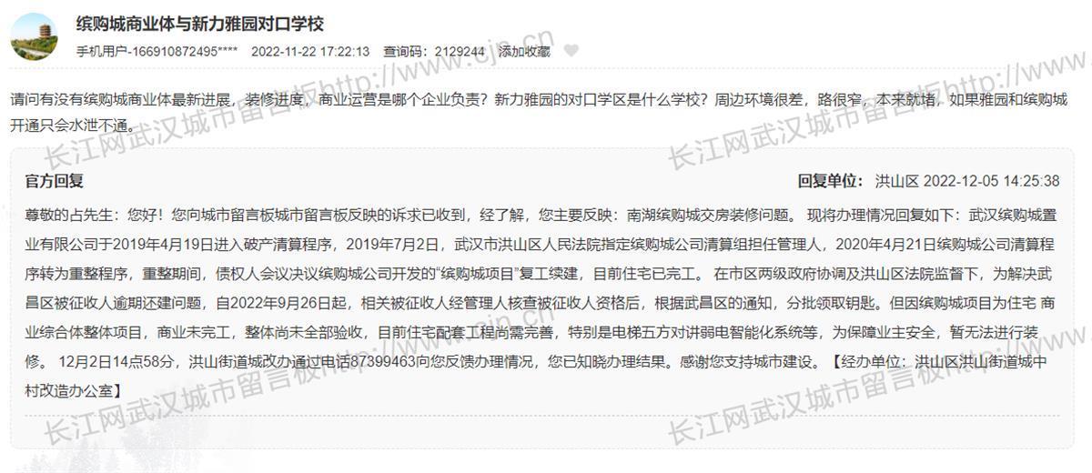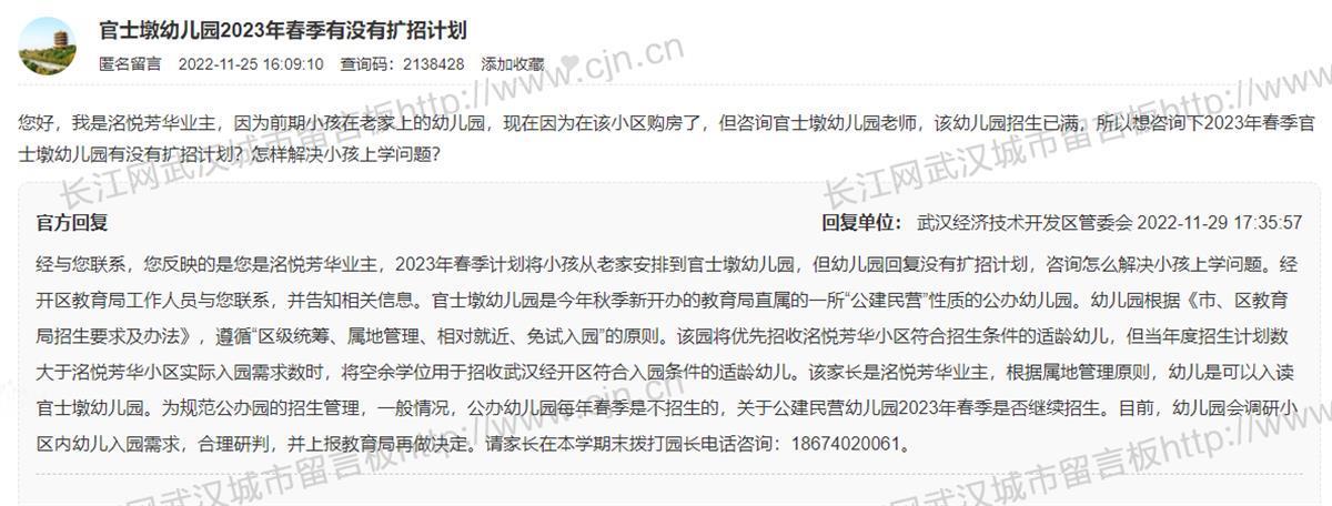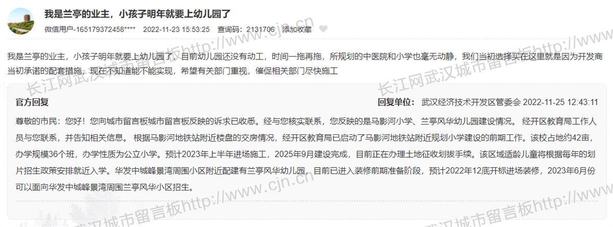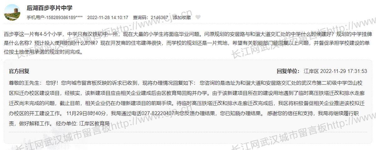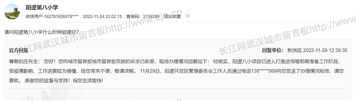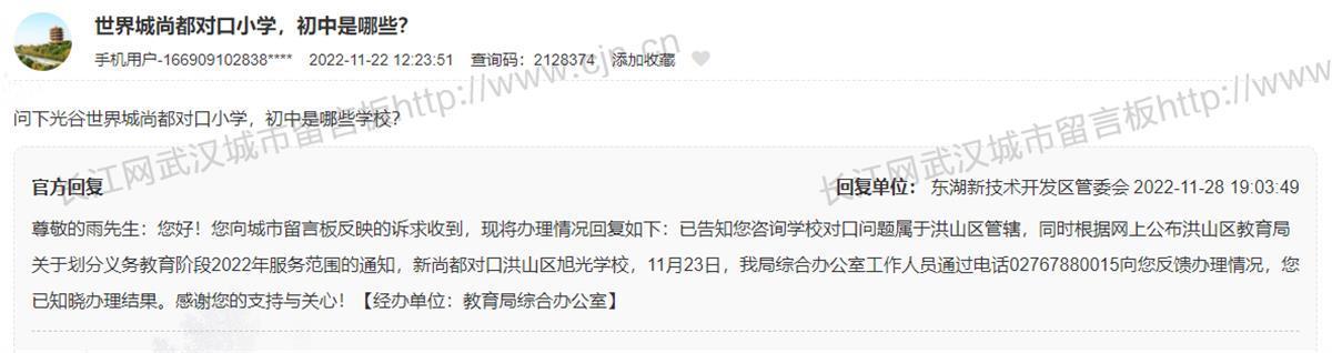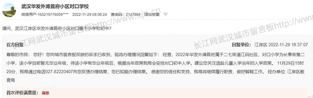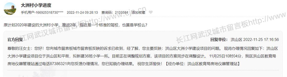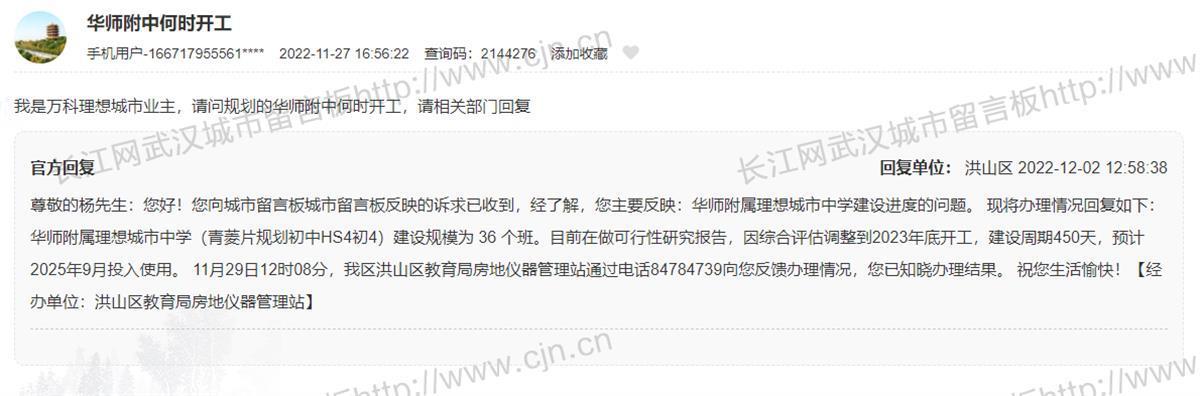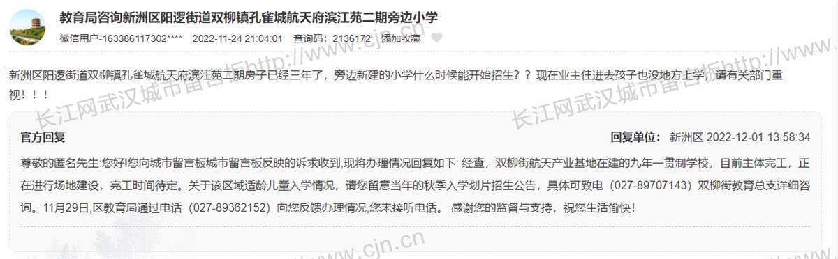 12月6日,极目新闻记者从武汉城市留言板上看到,有网友对家附近的对口学校以及最新进展进行了咨询,相关部门也给出了回复。