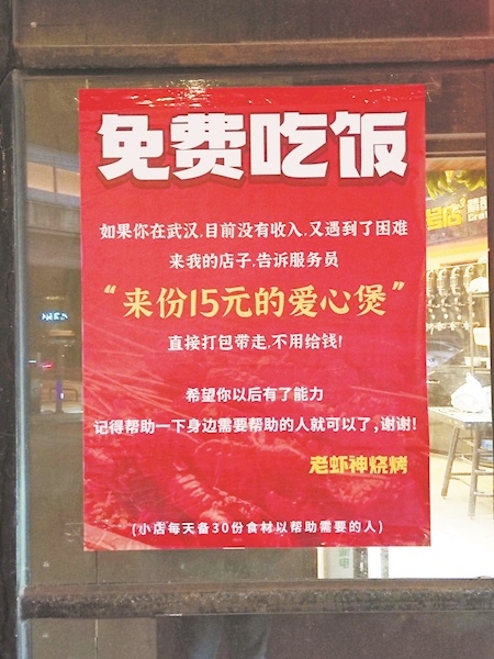 楚天都市报极目新闻讯(记者邱睦)“如果你在武汉,目前没有收入,又遇到了困难,来我的店子,告诉服务员‘来一份爱心煲’。”近日,武汉市汉阳区一家烧烤店门口的一张“免费吃饭”海报,吸引了食客注意。据老板王思思介绍,她希望通过此举,帮助那些生活遇到困难的人渡过难关。