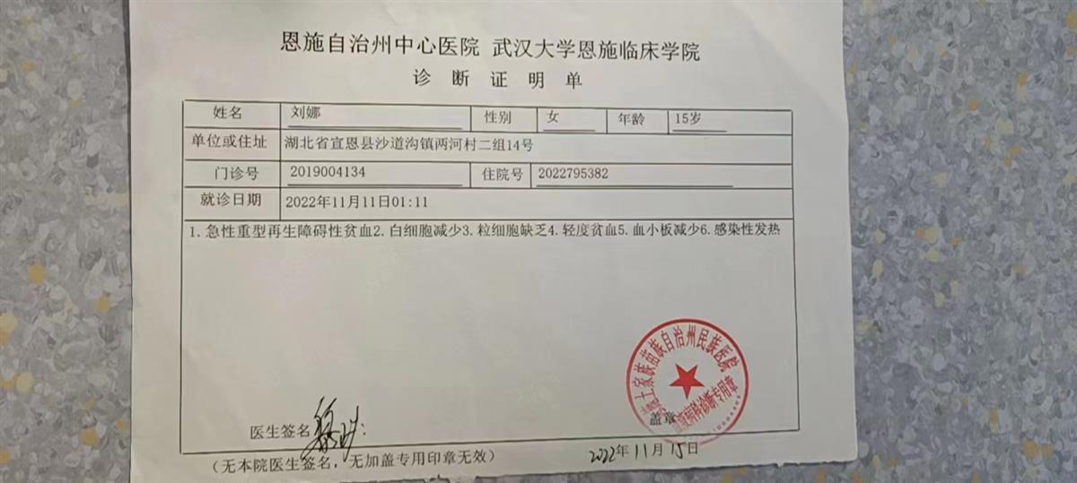 “我女儿平时身体没有什么问题,但在11月8日,没有任何征兆,她身上出现了一些紫色的斑。”肖女士说,“第二天,紫色的斑就扩散得全身都是,还伴随有牙齿出血等症状。”肖女士见此状况赶紧将刘娜带去了医院,经恩施当地医院诊断,刘娜患上的是急性再生障碍性贫血,是一种发病急,进展快的骨髓衰竭性疾病。除了皮肤黏膜出血,鼻腔牙龈出血以外,刘娜已经出现内脏出血的症状,病情严重。