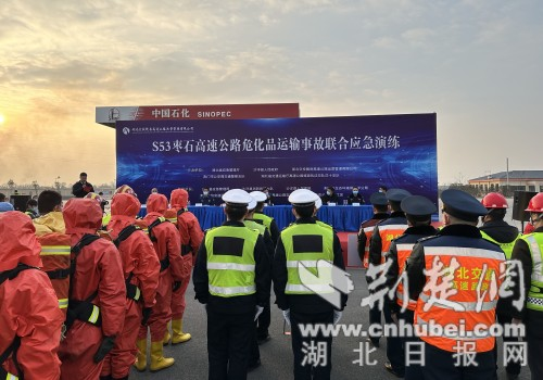荆楚网(湖北日报网)讯(通讯员 石云生)12月7日,荆门市交警支队高速大队联合汉十路政支队枣潜二大队、随岳运营公司、沙洋应急管理局、生态环境沙洋分局、沙洋消防救援大队、沙洋人民医院、高开项目部、荆门骏安施救公司等部门开展2022年危化品车辆运输事故联合应急演练。