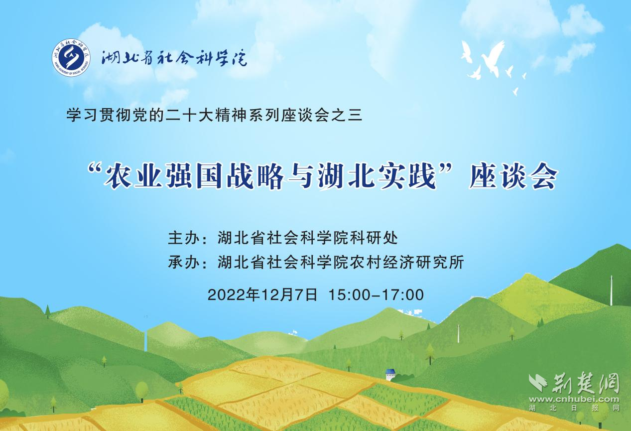 荆楚网(湖北日报网)讯(通讯员 曾琳琳 朱帅)农业是立国之本,强国之基。党的二十大报告提出“加快建设农业强国”,为我国农业现代化建设指明了方向和目标。2022年12月7日,湖北省社会科学院召开“农业强国战略与湖北实践”线上座谈会。来自中国社会科学院农村发展研究所、中共湖北省委农村工作领导小组办公室、湖北省农业农村厅和湖北省社会科学院的专家们通过网络会议的形式,围绕“加快建设农业强国”畅所欲言。
