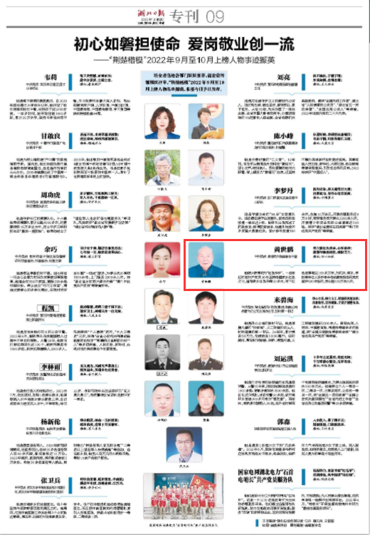12月13日,《湖北日报》公布2022年9月至10月“荆楚楷模”名单,其中,孝感市大悟县退休干部黄世鹏光荣上榜。