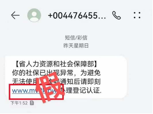 近日,有网民反映收到短信称“你的社保已出现异常,为避免无法使用,收到通知后请即刻办理登记认证”,并附上网站链接。
