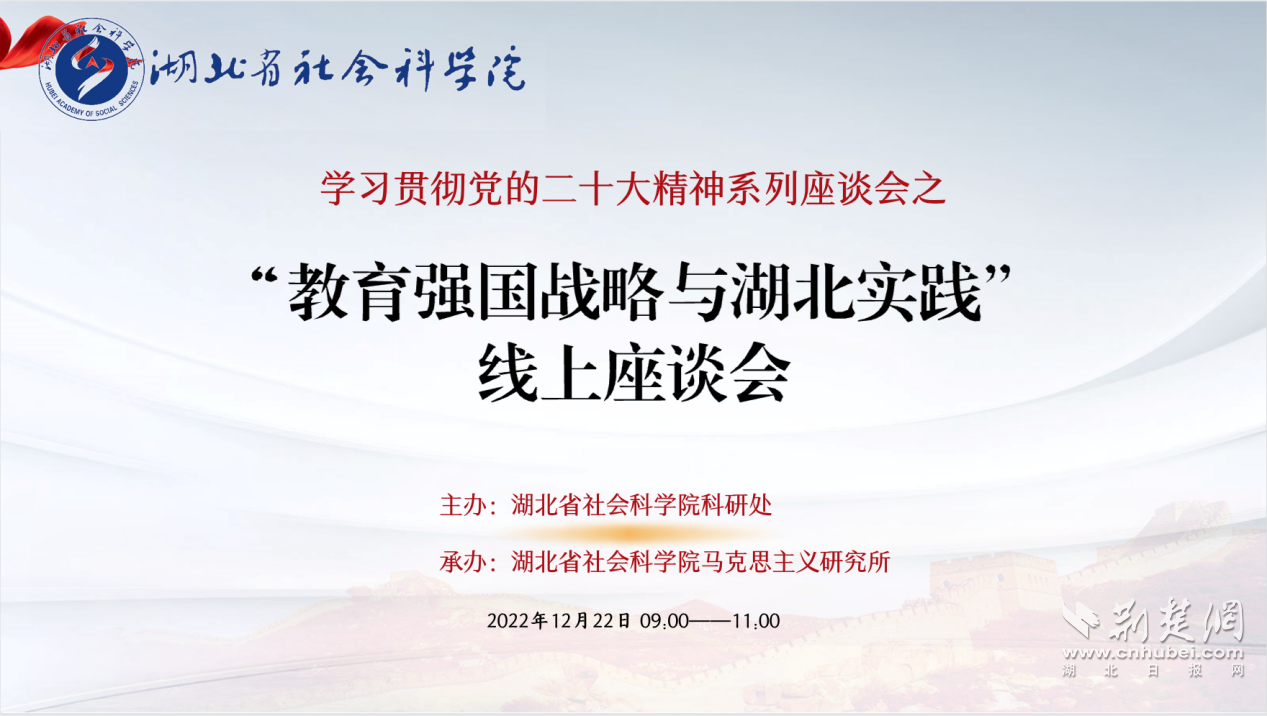 荆楚网(湖北日报网)讯(通讯员 张靖 徐伟)2022年12月22日上午,省社科院于线上召开学习贯彻党的二十大精神系列之“教育强国战略与湖北实践”座谈会。来自省中小学教师继续教育中心,武汉爱立方儿童教育传媒股份有限公司,省社科院科研处、社会学研究所、经济研究所和马克思主义研究所的十余名专家及师生代表参会,会议由马克思主义研究所所长罗志刚主持。