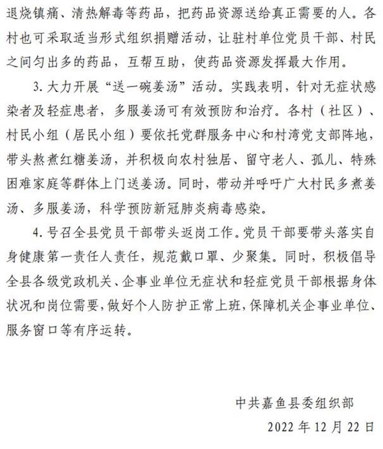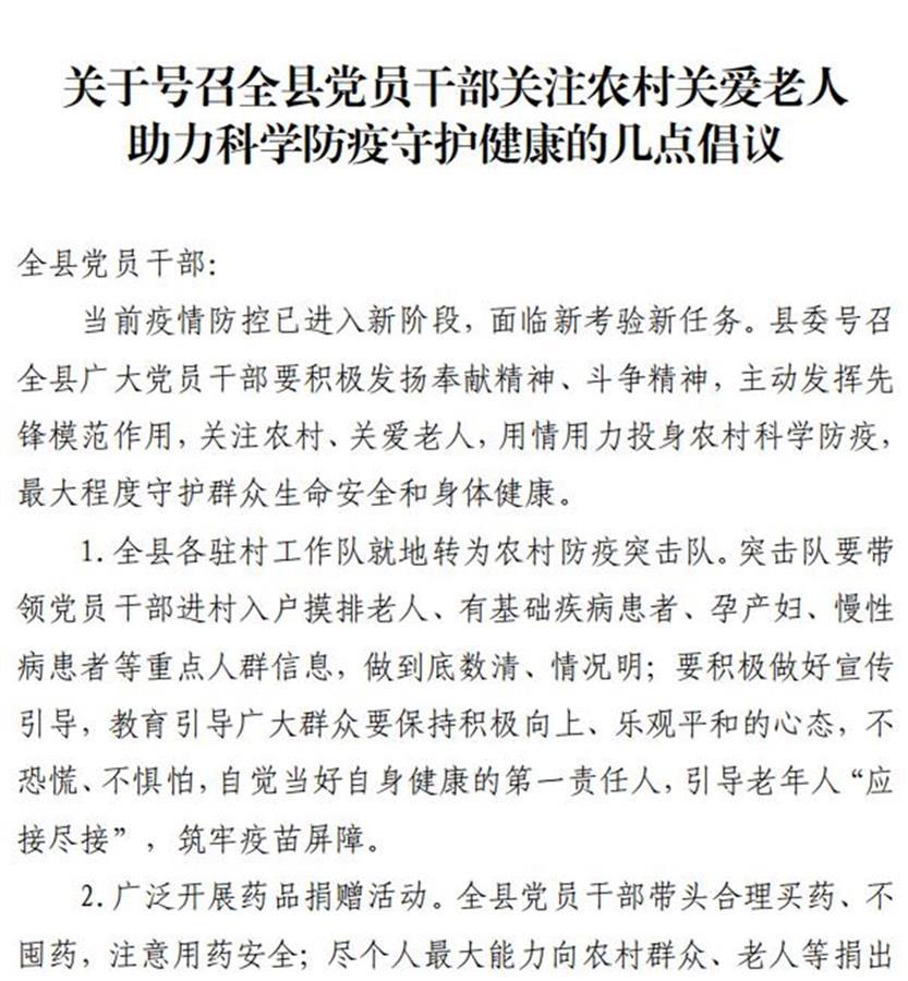 12月23日,嘉鱼县委向全县党员干部发出倡议,号召全县广大党员干部要积极发扬奉献精神,主动发挥先锋模范作用,关注农村、关爱老人,用情用力投身农村科学防疫,最大程度守护群众生命安全和身体健康。具体倡议内容如下: