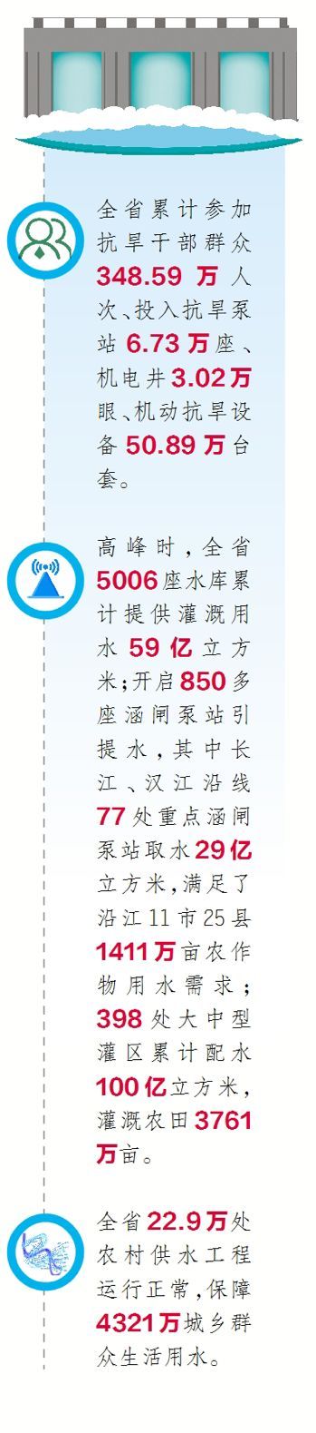 据介绍,今年抗旱期间,高峰时段有5006座水库放水灌溉,日供水1亿立方米,全省水库累计提供抗旱用水59.3亿立方米,同时开启850多座涵闸泵站引提水;398处大中型灌区累计配水100亿立方米,灌溉农田3761万亩,为粮食丰收提供坚强支撑。