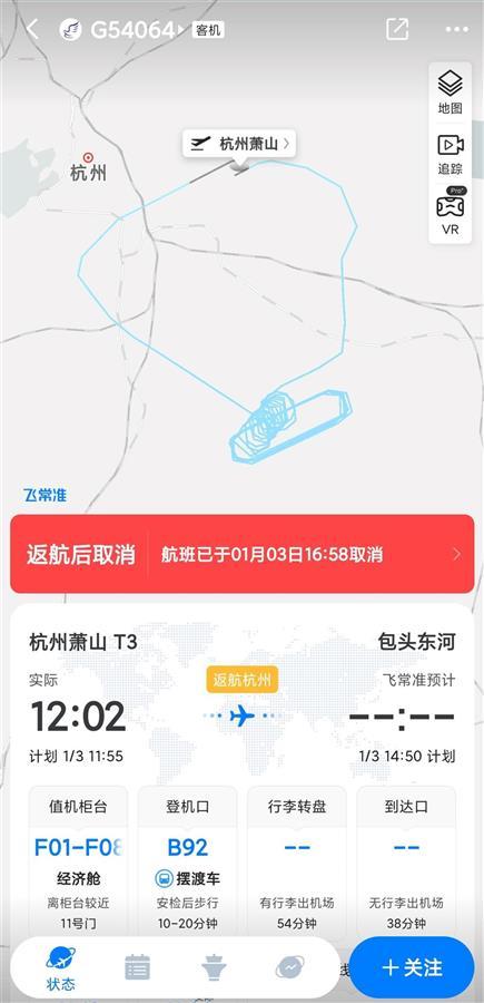 4日上午,极目新闻记者从航班出行服务APP“飞常准”上看到,该趟航班原计划是3日上午11时55分从杭州萧山机场起飞,下午2时50分落地包头东河机场。3日该航班在返航后,于当天下午4时58分宣布取消,4日该航班正常运营。