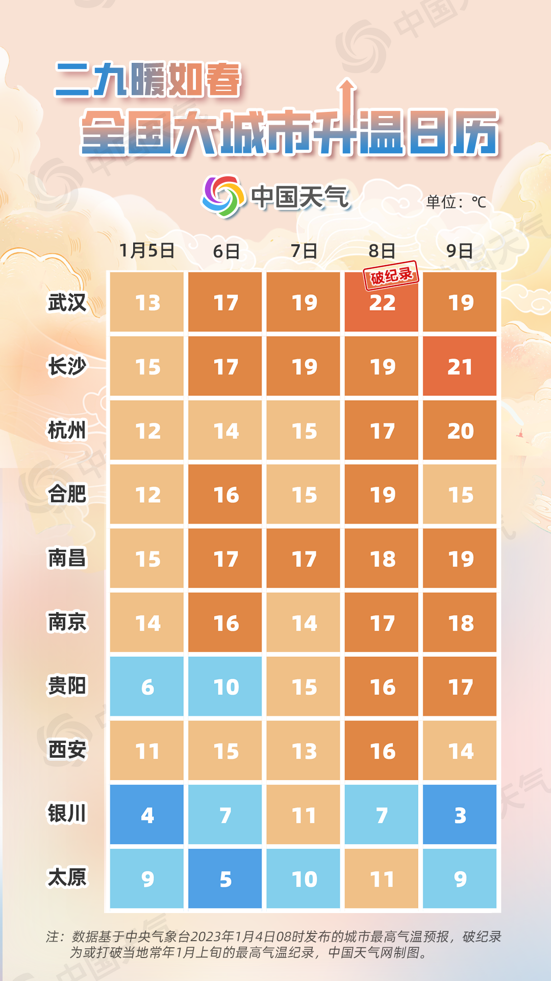 中国天气网推出的全国大城市升温日历显示,这轮升温过程中,长江中下游等地是回暖最明显的区域,多地最高气温将突破20℃,暖如初春。武汉8日最高气温22°C、长沙9日21°C、杭州9日20°C、合肥8日19°C,都可能接近甚至会打破当地常年1月上旬气温最高纪录。