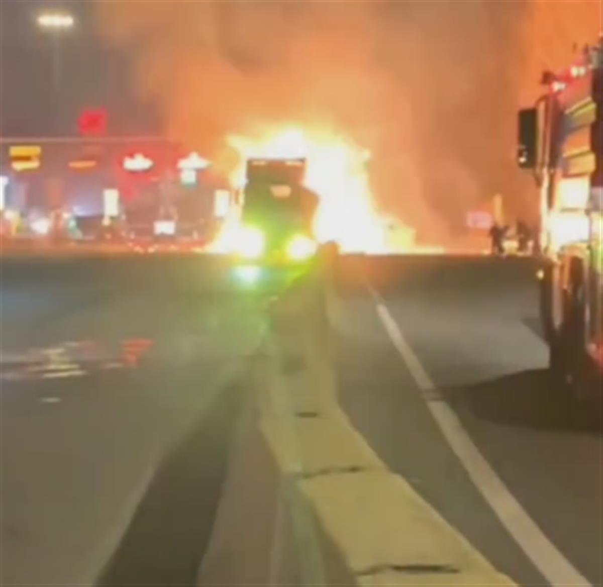 据多名网友发布的视频显示,一辆大货车疑似先是轮胎先起火,司机开着车在周家村收费站口不停地转圈圈,火随后逐渐蔓延到了车身,并伴随着声声爆响。后来有消防车赶来,将火扑灭。