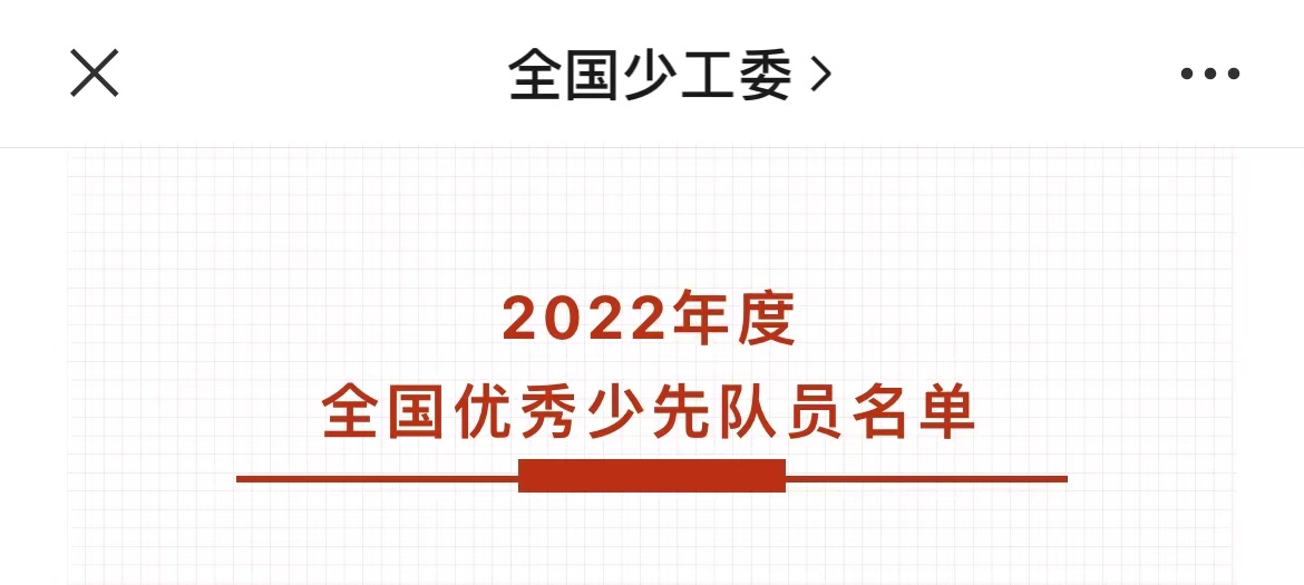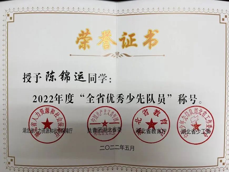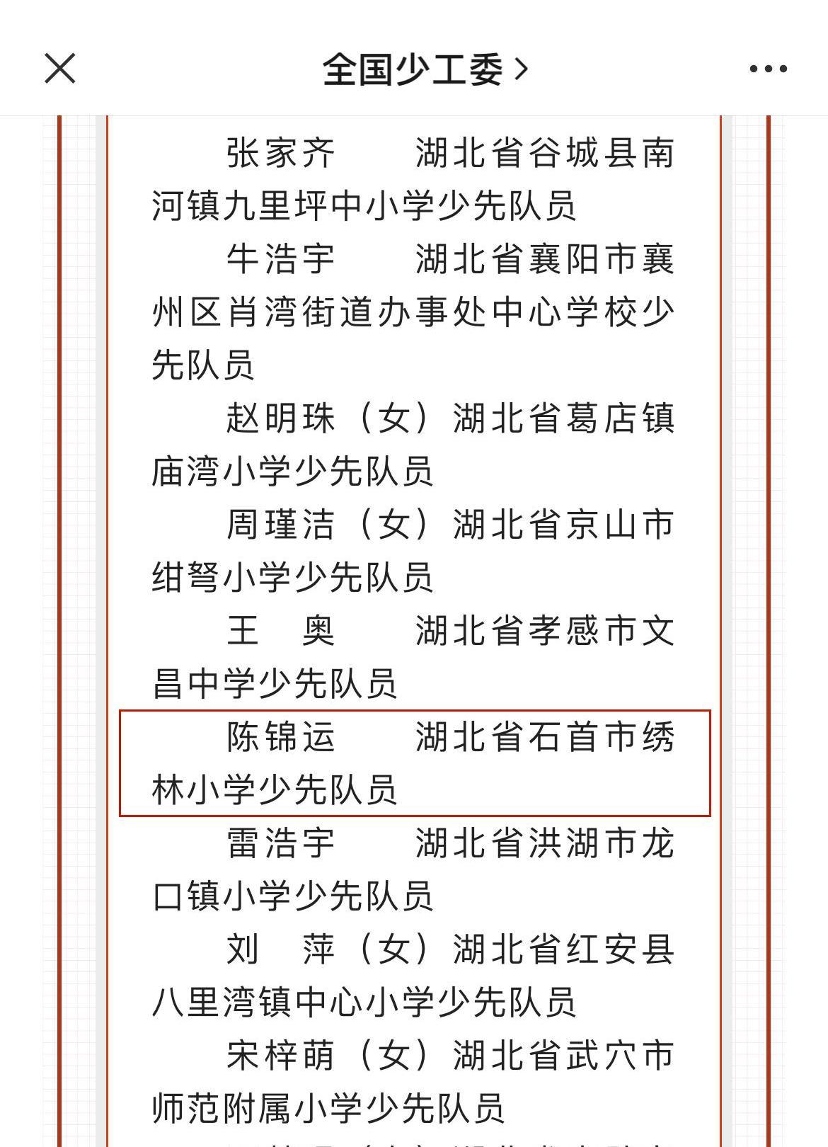 近日,共青团中央、教育部、全国少工委公布了关于表彰2022年度全国优秀少先队员、全国优秀少先队辅导员、全国优秀少先队集体的决定,湖北省石首市绣林小学少先队员陈锦运荣获2022年度“全国优秀少先队员”荣誉称号。
