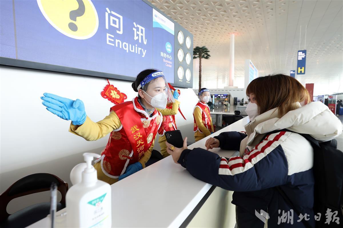 天河机场航站区管理部副主任王丽华介绍,针对今年的春运特点,武汉天河机场全面提升服务品质。针对值机、安检等关键环节,机场安排了“值机服务大使”提前对旅客进行分流引导,并针对“首乘”等特殊旅客提供“订制化”的专属服务。在安检预检区域放置了禁限物品自弃箱、打火机处理箱、自助寄快递柜、雨伞套袋机等自助服务设备,方便旅客使用。在旅客提取行李区域,全行业首创推出行李转盘机器人,实现全自动行李“扶一扶”功能,对下滑行李进行缓冲保护。