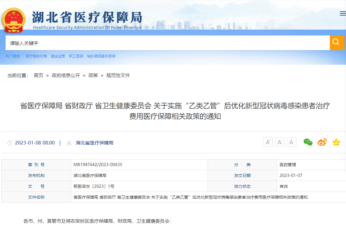根据《国家医保局 财政部 国家卫生健康委 国家疾控局关于实施“乙类乙管”后优化新型冠状病毒感染患者治疗费用医疗保障相关政策的通知》通知,按照“乙类乙管”总体方案“保健康、防重症”要求,为确保人民群众平稳度过感染高峰期,决定对我省医疗保障相关政策进行优化调整,现将有关事项通知如下: