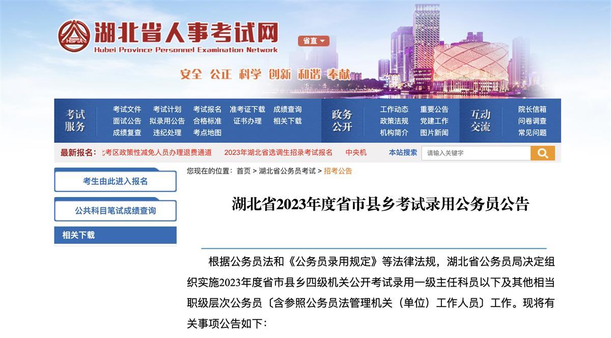 湖北日报讯(记者李婷)湖北省2023年度省市县乡考试录用公务员报名即将开始,共计划招录11268人。考生可于1月10日9:00至1月16日17:00期间登录“湖北省人事考试网”进行网上报名。公共科目笔试时间为2月25日,公安专业科目考试和综合知识测试时间为2月26日。笔试主考区设在武汉市,各市(州)、直管市、神农架林区设置分考区。