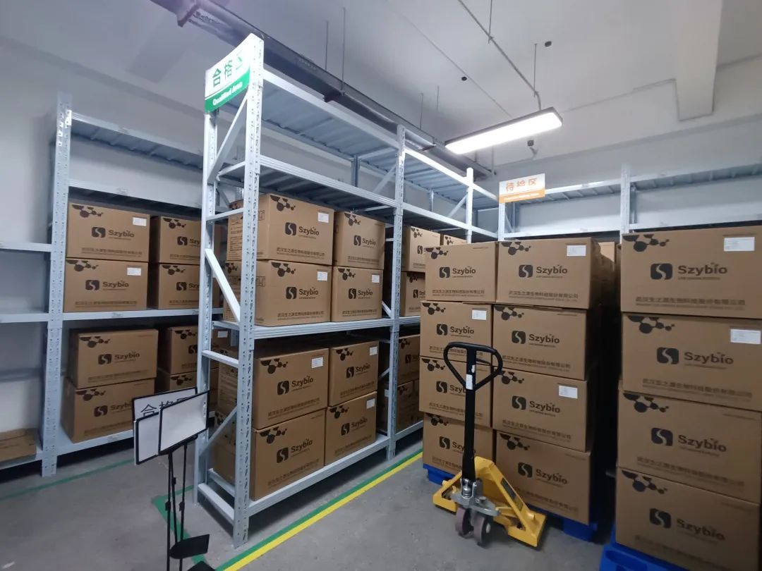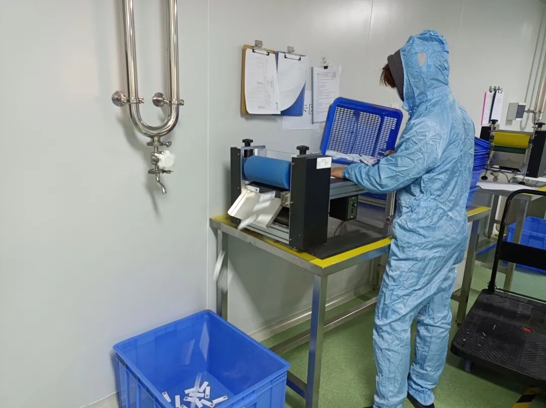 在位于三楼千余平方米的10万级洁净负压生产车间,记者看到,一块块胶体金大板在工人稳准利落的机器操作下变为细小的胶体金条。随着身着蓝色连体洁净服的工人手指不断飞舞,胶体金条被固定在塑料卡壳中组装成一个个试剂卡,然后经初检、压装、全检、机器封口后运往四楼包装。